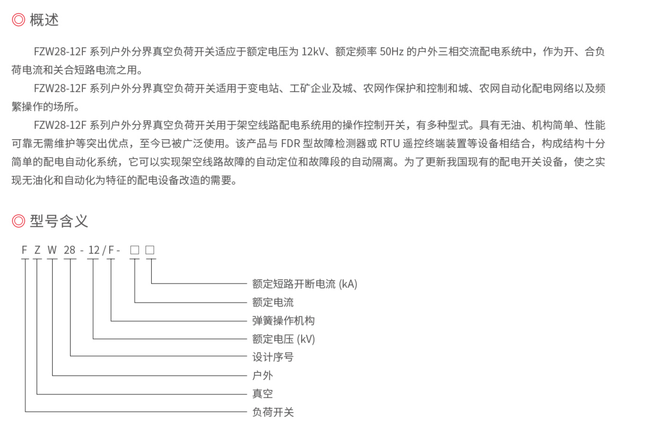 FZW28-12F系列户外分界真空负荷开关适应于额定电压为12kV、额定频率50Hz的户外三相交流配电系统中,作为开、合负荷电流和关合短路电流之用。