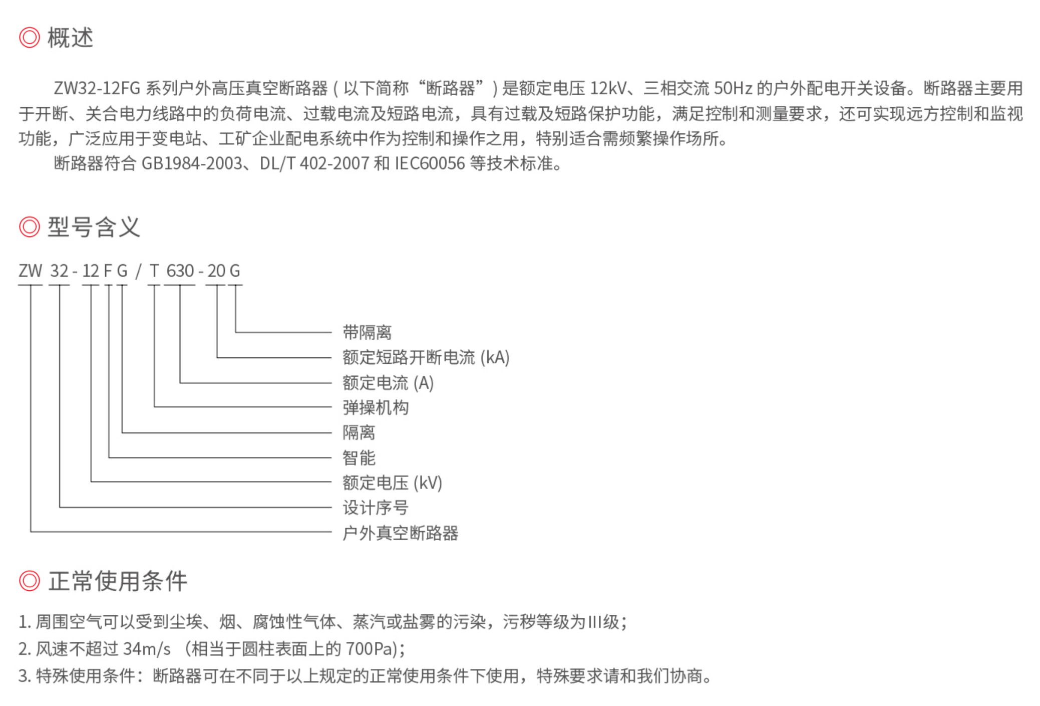ZW32-12FG系列户外高压真空断路器(以下简称“断路器”)是额定电压12kW、三相交流50Hz的户外配电开关设备。断路器主要用于开断、关合电力线路中的负荷电流、过载电流及短路电流,具有过载及短路保护功能,满足控制和测量要求,还可实现远方控制和监视功能,广泛应用于变电站、工矿企业配电系统中作为控制和操作之用,特别适合需频繁操作场所。断路器符合GB1984-2003、DL/T402-2007和IEC60056等技术标准。
