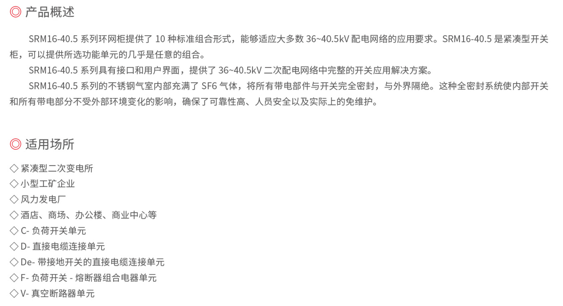 SRM16-40.5 系列环网柜提供了10种标准组合形式,能够适应大多数36~40.5kV配电网络的应用要求。SRM16-40.5是紧凑型开关柜,可以提供所选功能单元的几乎是任意的组合。