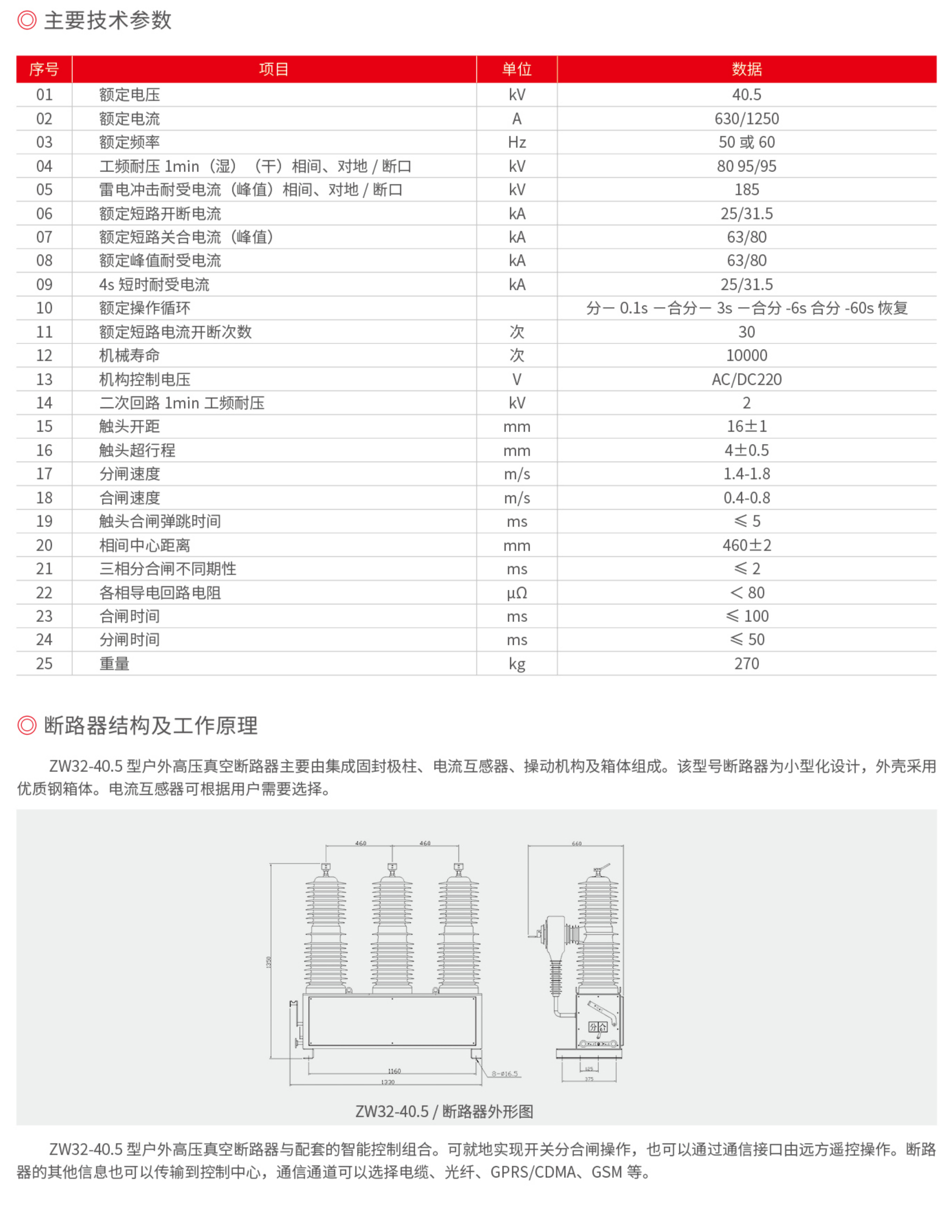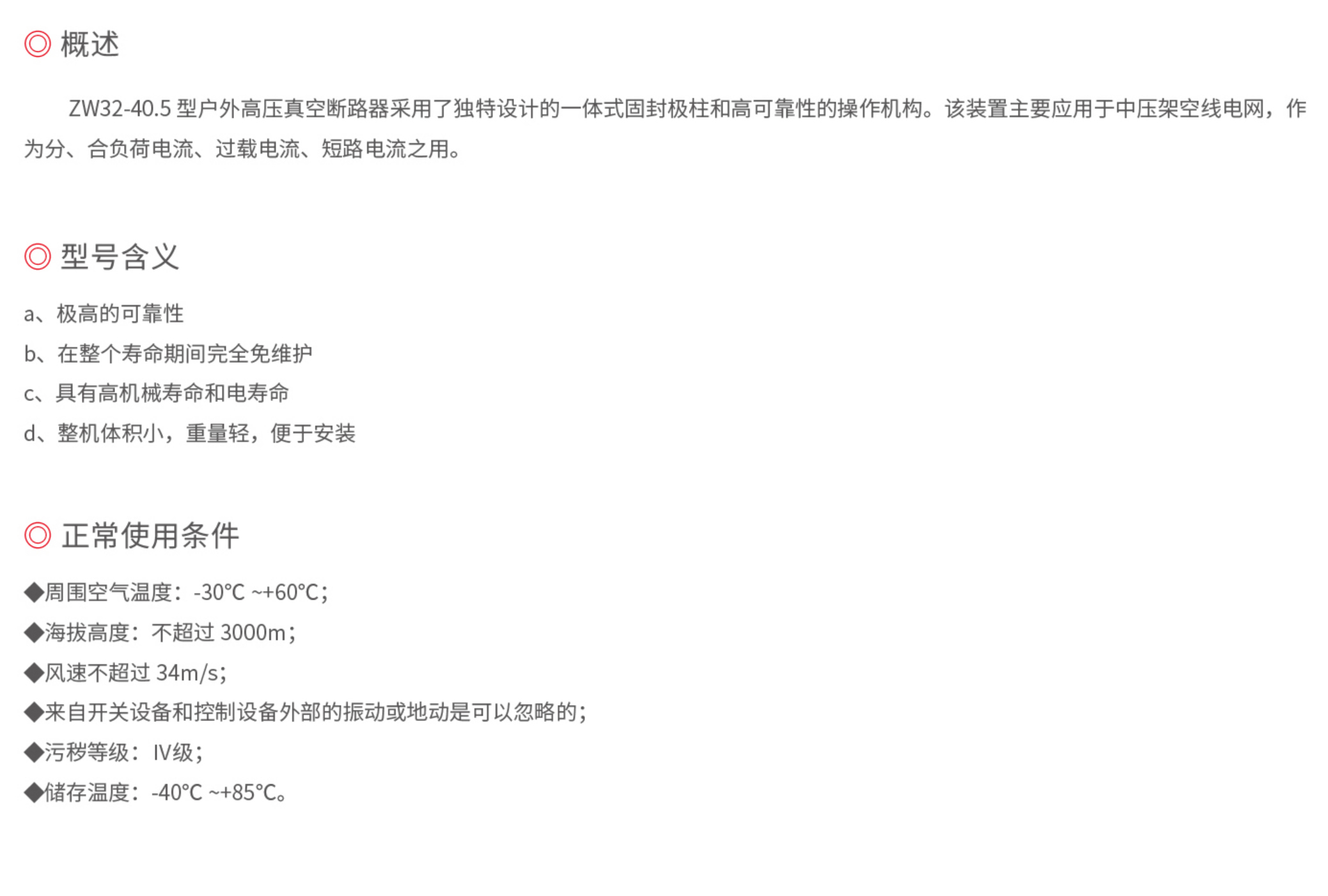 ZW32-40.5 outdoor high voltage vacuum circuit breaker adopts a unique design of integrated solid seal pole and high reliability operating mechanism. The device is mainly used in the medium voltage overhead line power network as the division and combination of load current, overload current and short circuit current.